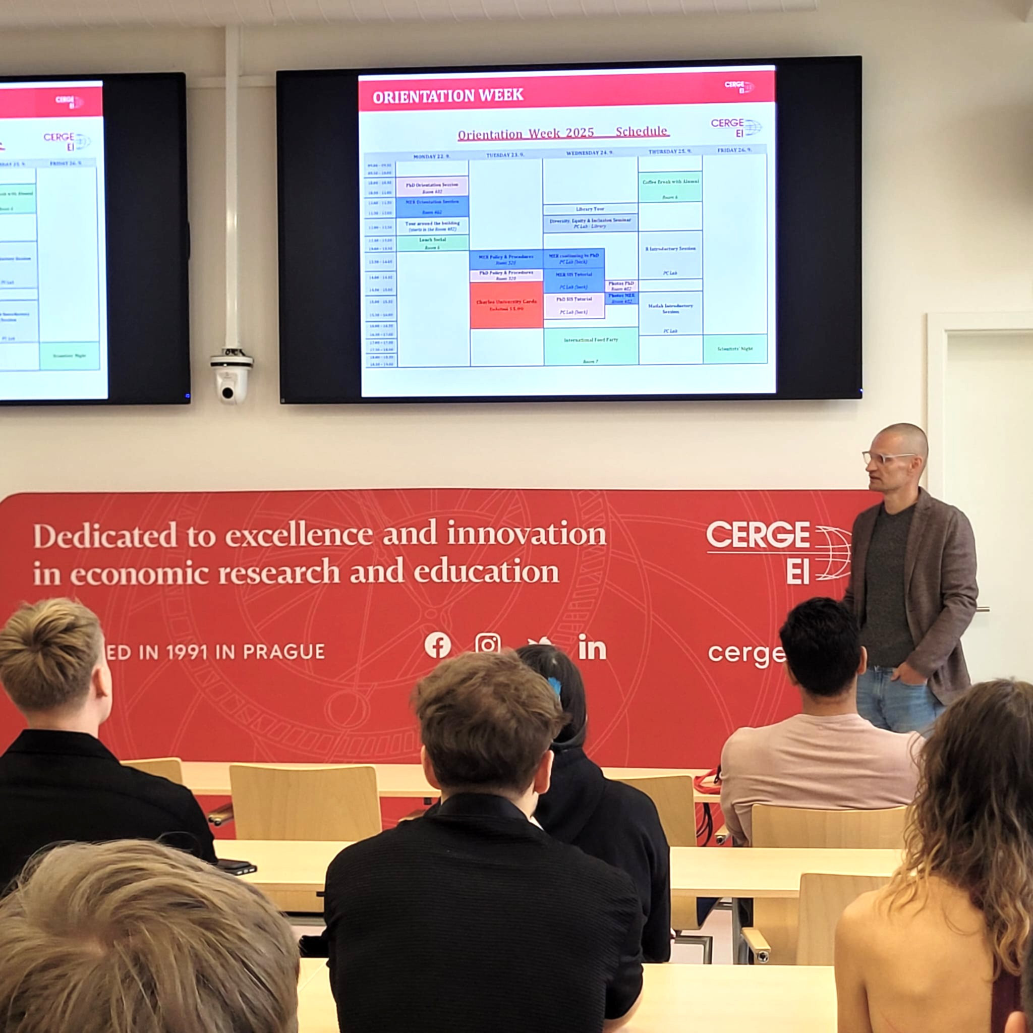 Srdečně také vítáme naše nové studenty, kteří nastupují do doktorského programu Ekonomie a ekonometrie a magisterského programu Ekonomický výzkum. Pocházejí celkem z 12 různých zemí. Poprvé se také setkáváme studenty bakalářského programu Economics of Markets and Organizations, který probíhá ve spolupráci s Vysokou školou ekonomickou v Praze a CERGE-EI. Náš Academic Exchange Program (AEP) se letos pyšní nejpočetnější skupinou účastníků.